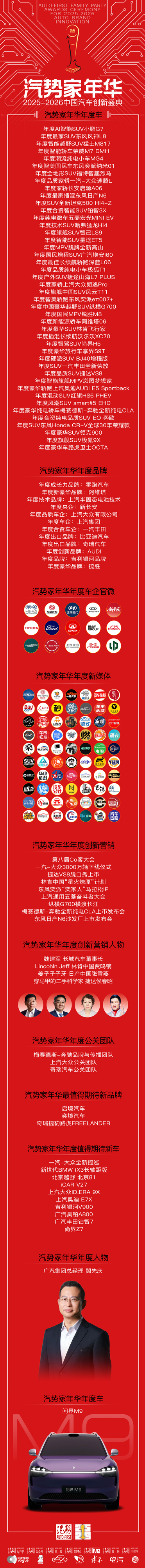 正是基于对产业深刻变革的洞察,本届汽势家年华的奖项评选体系科学而多元,完成了一次从“车”到“人”、从“前台”到“幕后”的完整呈现。评选历经市场表现调研、专业评测、专家与消费者投票等多重环节,旨在从年度车、年度车企、年度品牌、年度营销、年度车企官微、年度创新营销达人、年度公关团队,以及车企社会责任ESG年度金钥匙、年度新媒体和2026年最值得期待新车、新品牌等多个维度,褒奖中国汽车行业的2025的沉甸甸,以及2026年的未来可期。