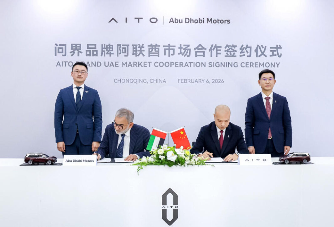 2026年2月6日,中国豪华汽车引领者AITO问界与阿联酋头部豪华汽车经销商集团 Abu Dhabi Motors(以下简称 ADM)在中国重庆正式签署战略合作协议。赛力斯汽车海外BU总裁王进与ADM CEO Syed Faiz Karim 代表双方签署协议,赛力斯汽车总裁何利扬与阿卜杜拉·本·穆罕默德·本·布蒂·阿勒哈米德阁下私人办公室中国区负责人赵頔见证签约。这次合作标志着AITO问界在海外高端新能源市场的布局取得关键进展,正式开启品牌全球化的新篇章。